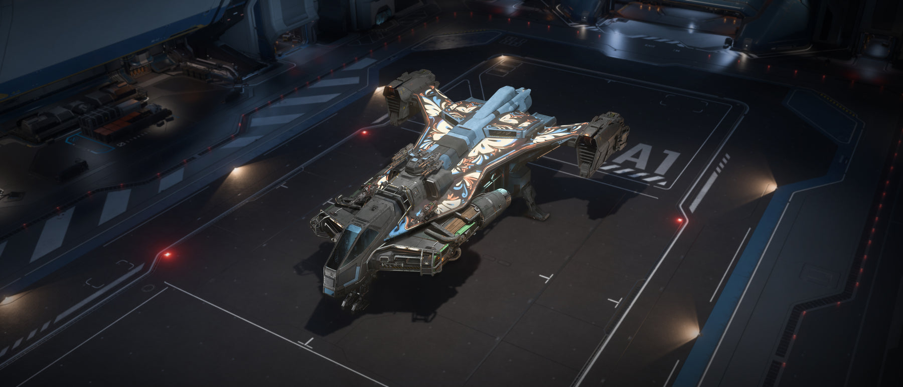 Turn the Grey's Market Shiv into a beauty and a brute with the Blue Blossom livery, featuring a colorful and ornate flower pattern across the top of the ship.