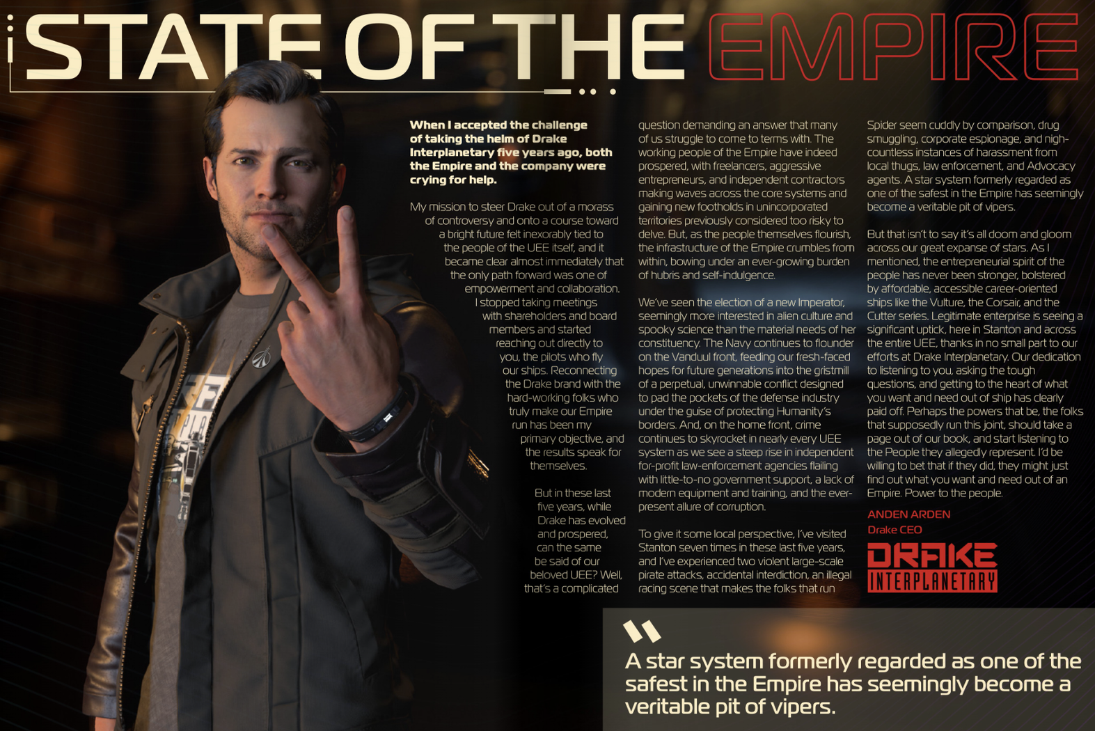 In 2875, a sensational holovid documentary titled “Bent Cutlass” accused Drake of ignoring background checks and selling ships to criminals. It didn’t help that one of those deals allegedly ended with 122 dead in a raid.