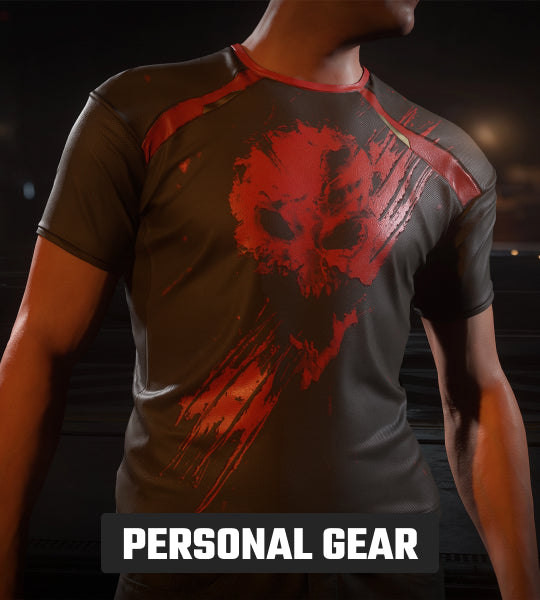 Inspired by classic military designs with CBD's own twist, the Malenky t-shirt features collar accents on both sides and a rear quarter-zip. The Skullsplitter version features a red Vanduul skull shattered by a bloody streak.