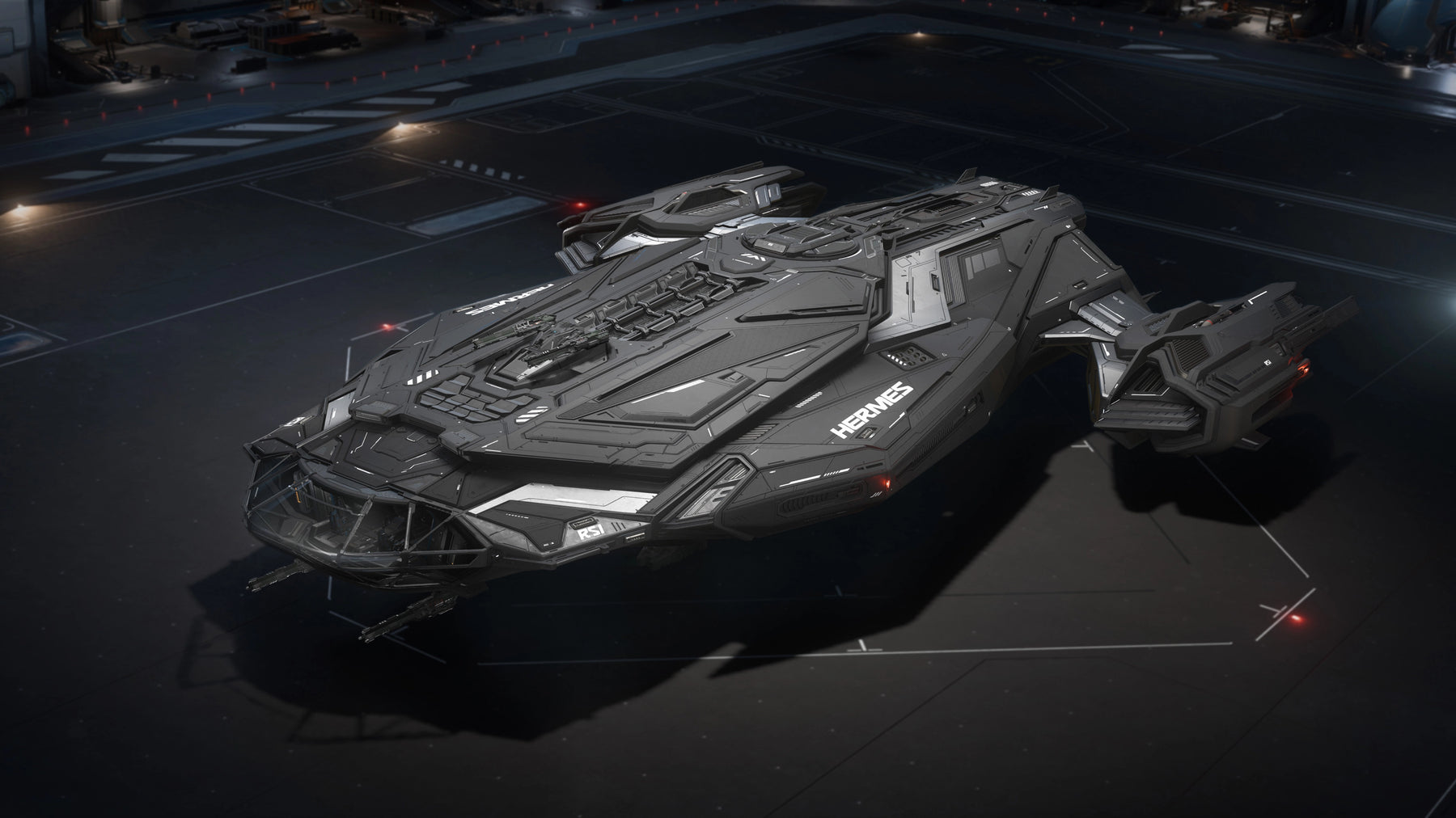 Sharp, silver accents cuts through the stark black of the Tripline livery's metallic color scheme for your RSI Hermes. Exclusive to members of the Chairman’s Club.