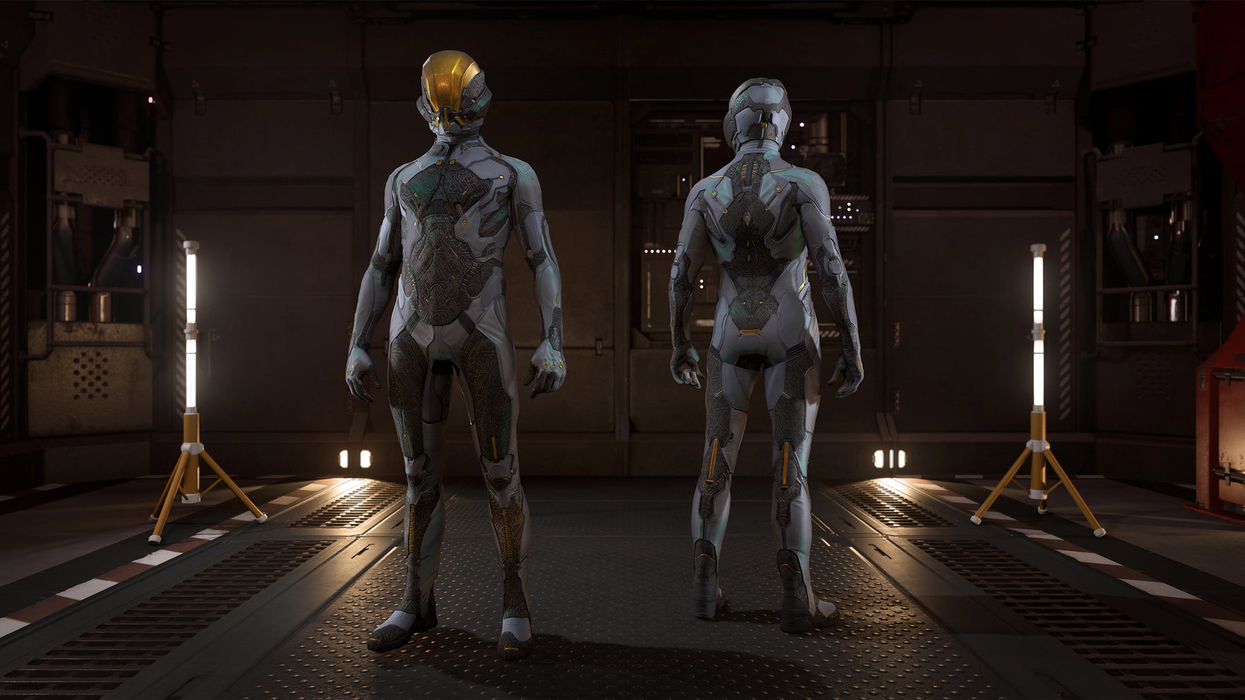 The Sabine undersuit and Calva helmet embody the advanced look and performance you expect from Quirinus Tech. This cutting-edge suit integrates strong yet flexible microweaves with strategically placed plating to provide protection while remaining lightweight. The Daybreaker edition features subtle yet striking gold highlights.